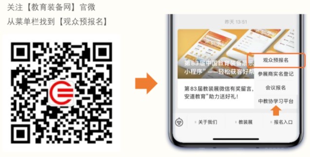 关注“教育装备网”微信公众号,点击公众号右下角“报名入口”进入“观众报名”,实名登记填写相关信息并生成报名码。凭报名码到现场可快速换取“参观证”进场观展。